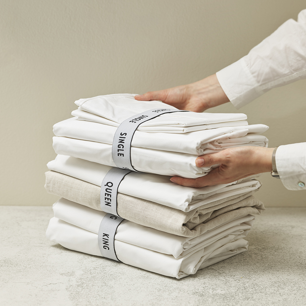 How to use: Fold your sheet or bedding set neatly. Stretch the correctly labelled elastic band around your linen for easy size identification and store until its next use.